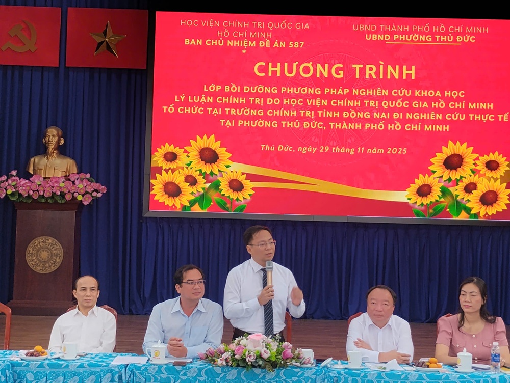 Phát biểu mở đầu buổi làm việc, TS Phan Xuân Linh trân trọng cảm ơn sự đón tiếp trọng thị, chu đáo của lãnh đạo UBND phường Thủ Đức; đồng thời nhấn mạnh chương trình nghiên cứu thực tế là dịp quan trọng để đội ngũ giảng viên và viên chức Trường Chính trị tỉnh Đồng Nai tăng cường học hỏi kinh nghiệm thực tiễn trong bối cảnh tỉnh Đồng Nai đã và đang triển khai mô hình chính quyền địa phương hai cấp. Đồng chí bày tỏ mong muốn nhận được sự chia sẻ của phường Thủ Đức về những cách làm sáng tạo, giải pháp hiệu quả trong tổ chức bộ máy, ứng dụng chuyển đổi số, cải cách hành chính, qua đó góp phần cung cấp thêm cơ sở thực tiễn phục vụ công tác giảng dạy và tham mưu chính sách của đội ngũ cán bộ giảng viên nhà trường.