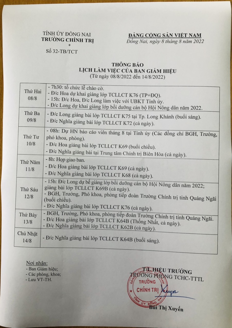 Lịch làm việc Ban giám hiệu từ ngày 01/8 đến ngày 07/8/2022