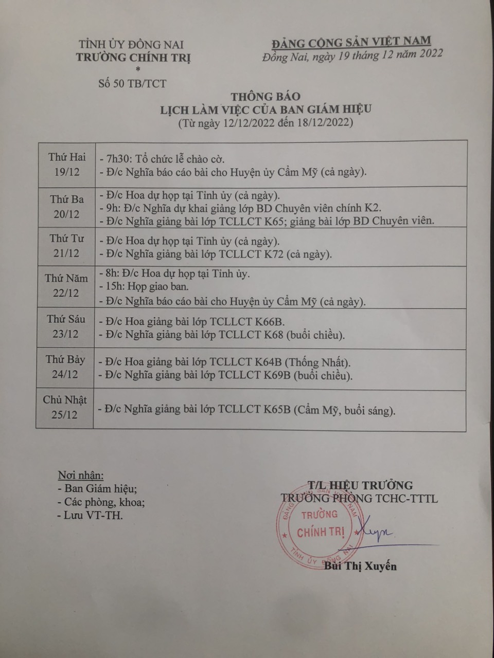 Lịch làm việc Ban giám hiệu từ ngày12/12 đến ngày 18/12/2022