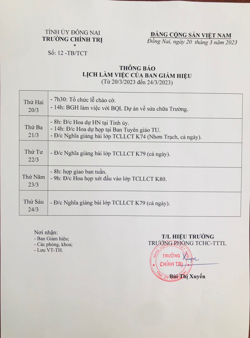 Lịch làm việc Ban giám hiệu từ ngày 20/3 đến ngày 25/3/2023