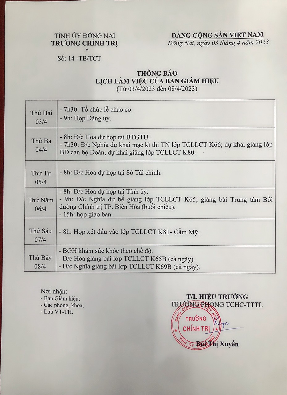 Lịch làm việc Ban giám hiệu từ ngày 03/4 đến ngày 08/4/2023